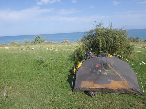 キルギス29日目 イシククル湖畔2〜ビシュケクから東南東に211km地点 川沿い 日中でも気温は過ごしやすい25度前後の環境ながら、日光が当···